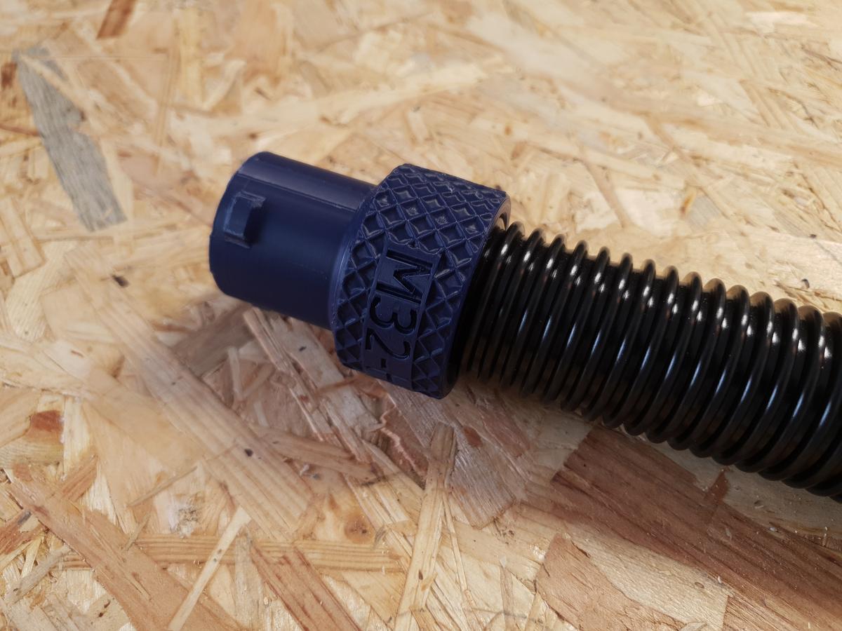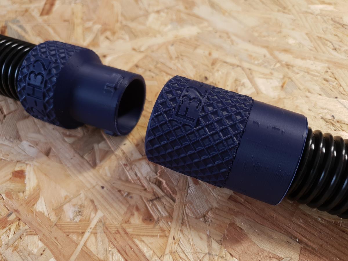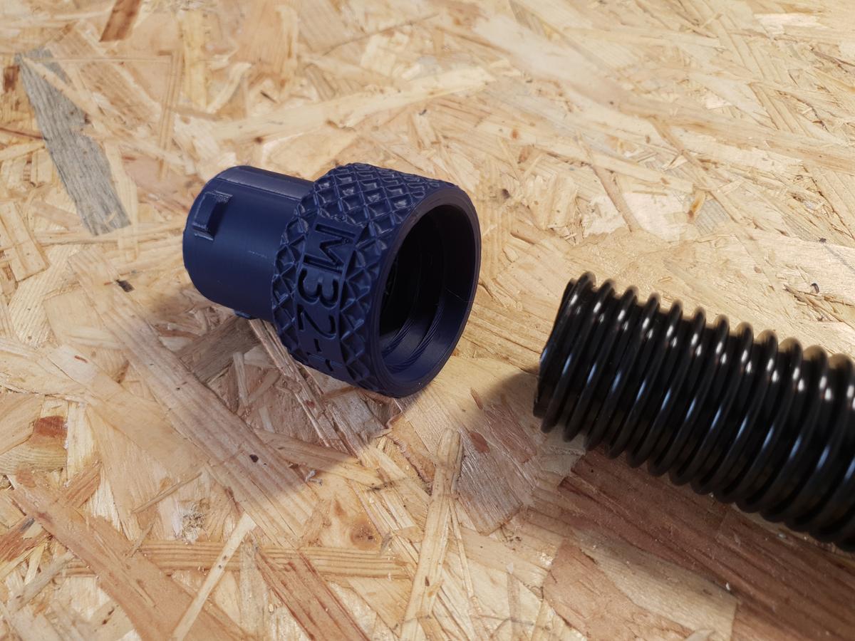 Der M32-H32 besitzt auf der einen Seite den Anschluss für deinen handelsüblichen Staubsaugerschlauch mit 32 mm Innendurchmesser und ca. 40 mm Außendurchmesser. Auf der anderen Seite bietet er den passenden Steckanschluss für den F32-H32 oder andere osVAC-Adapter.